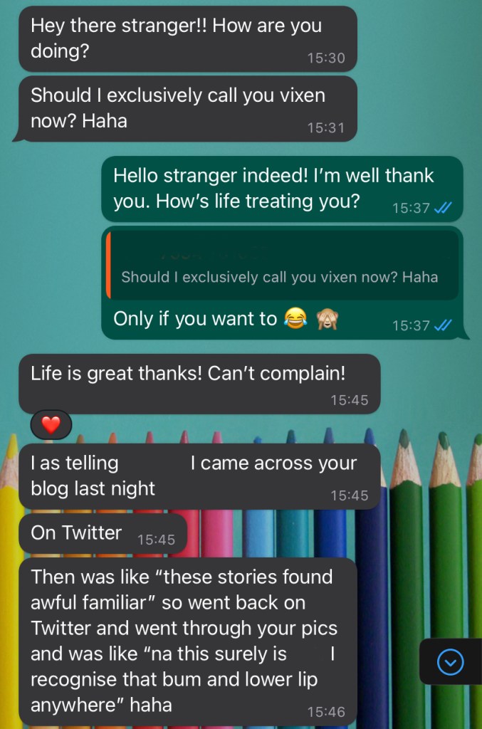 For the next couple of hours we caught up over WhatsApp and it was actually a huge weight off of my shoulders to talk openly about the blog and my presence on Twitter/X. Talk even turned to the actors who would play us when my blog was turned into a Hollywood movie – step aside Fifty Shades! However, it didn’t take long before the conversation soon drifted from social media to more casual chatter about life and what we’d both been up to. I had forgotten how easy it was to talk to this man and how similar our interests were as conversation turned to popular culture. Apart from our initial discussion about the blog, our chat had stayed very PG. Eventually I plucked up the courage to ask why he had decided to make contact with me after so long. Was it only because of his discovery of the blog? Was there more to this sudden communication? I must admit, by this point in the day, I was beginning to hope that there was another reason.